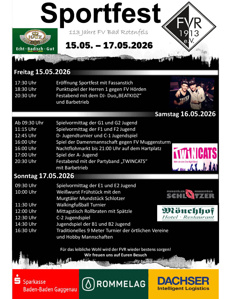 Vorbericht zum SportfestDer FV Bad Rotenfels lädt vom 15. bis 17. Mai 2026 zum großen Sportfest-Wochenende ein. Die Besucher erwartet dieses Jahr ein abwechslungsreiches Programm aus Sport, Unterhaltung und