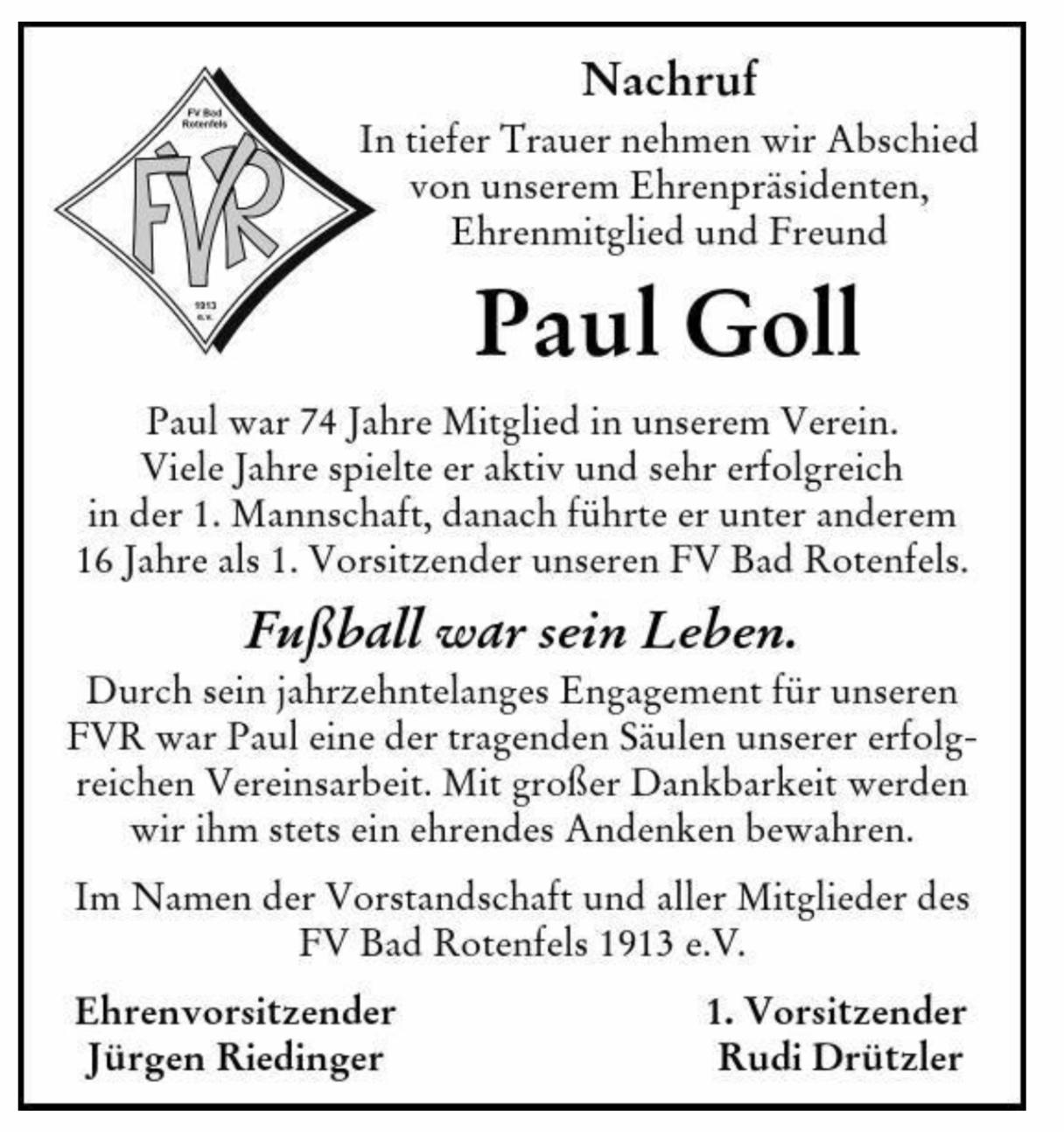 am Donnerstag, 31. März 2022, ist unser Ehrenpräsident, Vereinskamerad und Freund PAUL GOLL im Alter von 87 Jahren gestorben. Denkt man an den Fußballverein Bad Rotenfels, denkt man an Paul Goll. Der FVR hat ihm sehr viel zu verdanken. Unsere Gedanken sind bei seiner lieben Frau Inge, bei seinen Töchtern Andrea und Martina und bei allen, die um unseren lieben Paul trauern. Die Trauerfeier findet am Mittwoch, 6. April 2022 um 15:30 Uhr auf dem Friedhof in Bad Rotenfels statt. Es wäre toll, wenn viele FVR-ler kommen könnten, am besten im FVR-Outfit. Paul würde das sehr freuen!